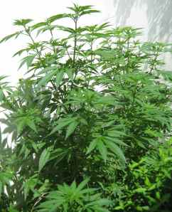 We grew 8 of the 10 seeds, 4 indoors, and 4 outdoors. Of the outdoor plants, we culled one plant that was faltering and became further weakened by insects. I should note that this was most likely a soil pH problem that was entirely our fault – the other 3 plants have thrived, and were only strengthened by the occasional insect attack. They required very little tending, and developed into strong, bushy indica-style plants. We topped the plants twice to encourage four thick top branches and keep the height manageable. This can be seen in the next picture, which was taken after about 8 weeks of outdoor growth: