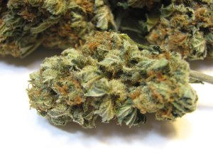 Bud appearance: 6 – Fairly compact buds that cured to a gray-green color with red/orange pistils. After drying, dried trichome “crystals” were obvious on the main buds, but not so much on side branch buds. This takes the “bling” factor off the appearance, but doesn’t mean it’s a weak smoke!