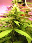 Here are newer pictures of the plants. They have continued to develop their own traits, and look even more different than the previous shots. The Double Gum is obviously sativa-influenced, and still smells strongly of Acacia/Honeysuckle. The Afghan Kush buds are fatter and stickier, albeit somewhat leafy – they’ll need extra care during trimming: