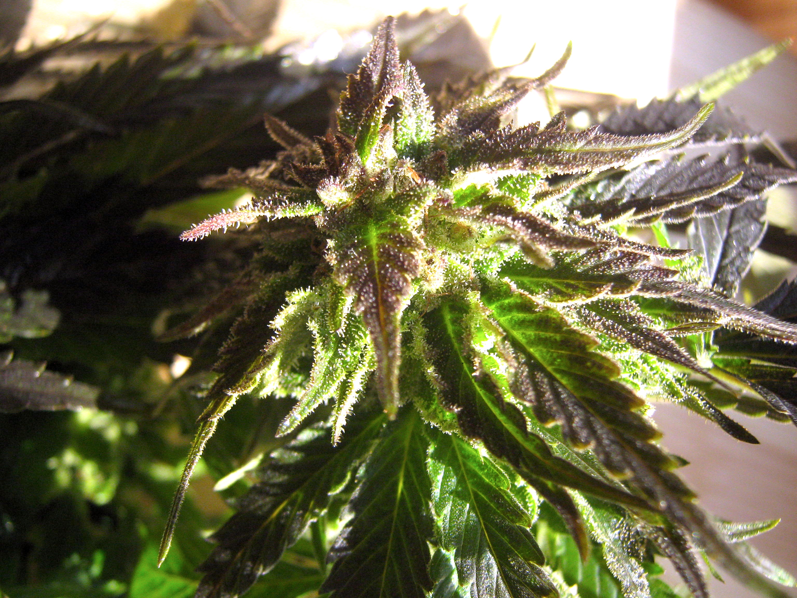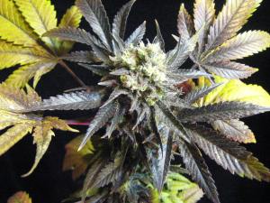 A closeup of a smaller side bud on the WSS Skunk plant grown outdoors and left until mid-November to show how dark purple colors can develop due to colder temperatures. (Note – these buds are not harvested or trimmed, and therefore appear quite “leafy” in the pictures.)