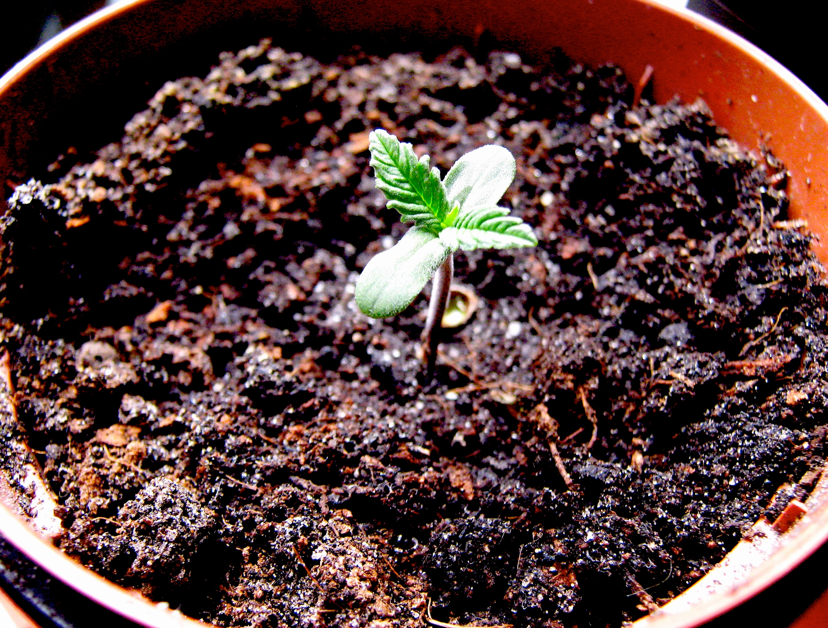 - Use only a non-fertilized sprouting substrate (soil). The roots of seedling plants are far more sensitive to over-fertilizing than adult plants, and marijuana fertilization is already a delicate task. I am not a fan of starting seeds in rockwool or fiberglass cubes, as this requires more handling of the seedlings. Instead, use basic non-fertilized potting soil. Place the soaked seed on the surface of the soil and sprinkle just a pinch of damp soil on top. Do not bury seeds in the soil.