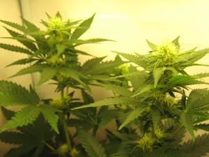 I know there are a lot of growers out there who would like to use hardware store supplies, and keep their power consumption down for various reasons. This journal is here to show what someone growing under these conditions can expect if they otherwise follow proper growing techniques. The above photo is the Dinafem Critical+ plant, and the following photo the Afghan Kush / Double Gum crossbreed. Both plants are now 8 weeks old (give or take a day or two) and have been flowering for just over two weeks.