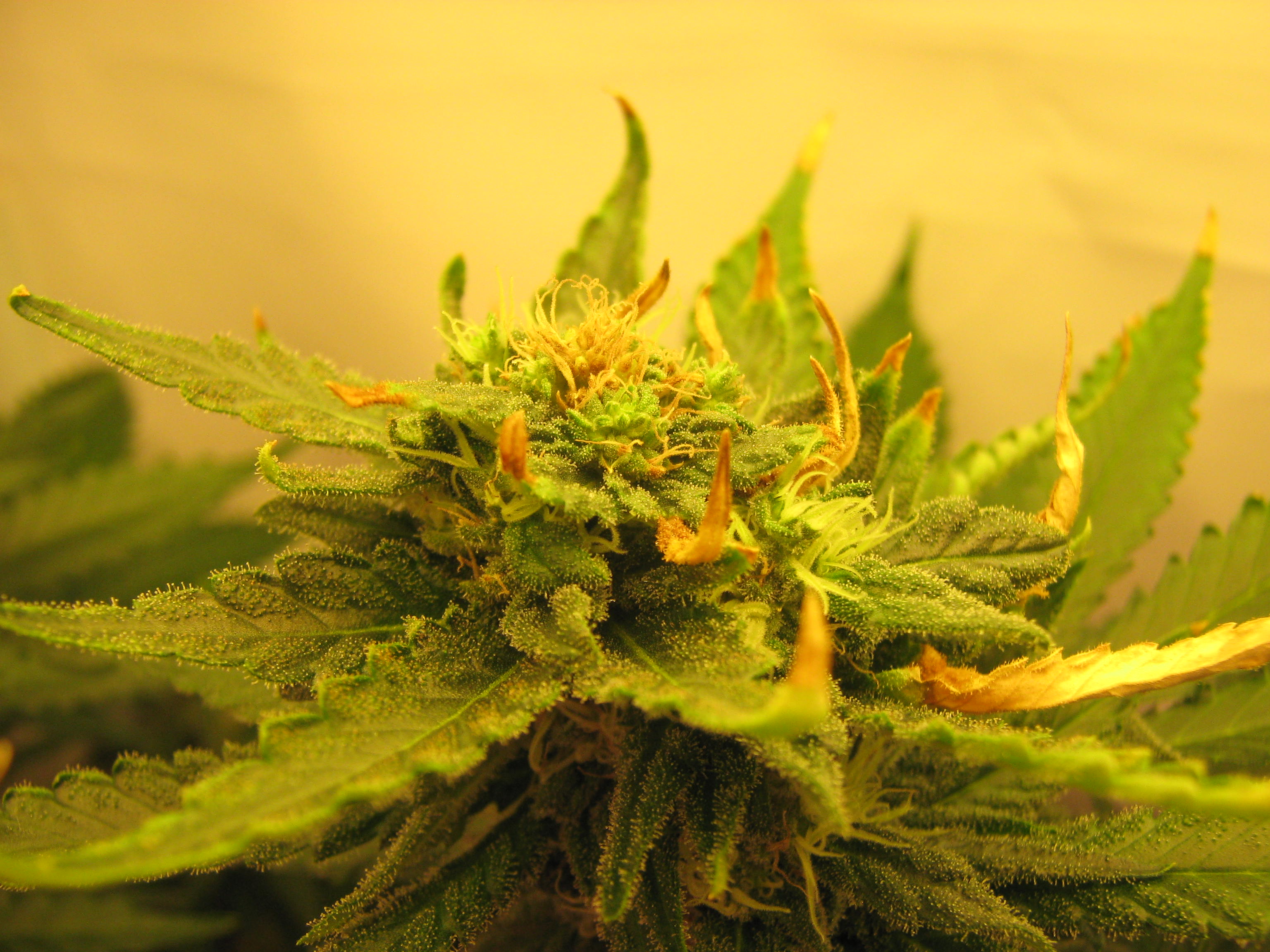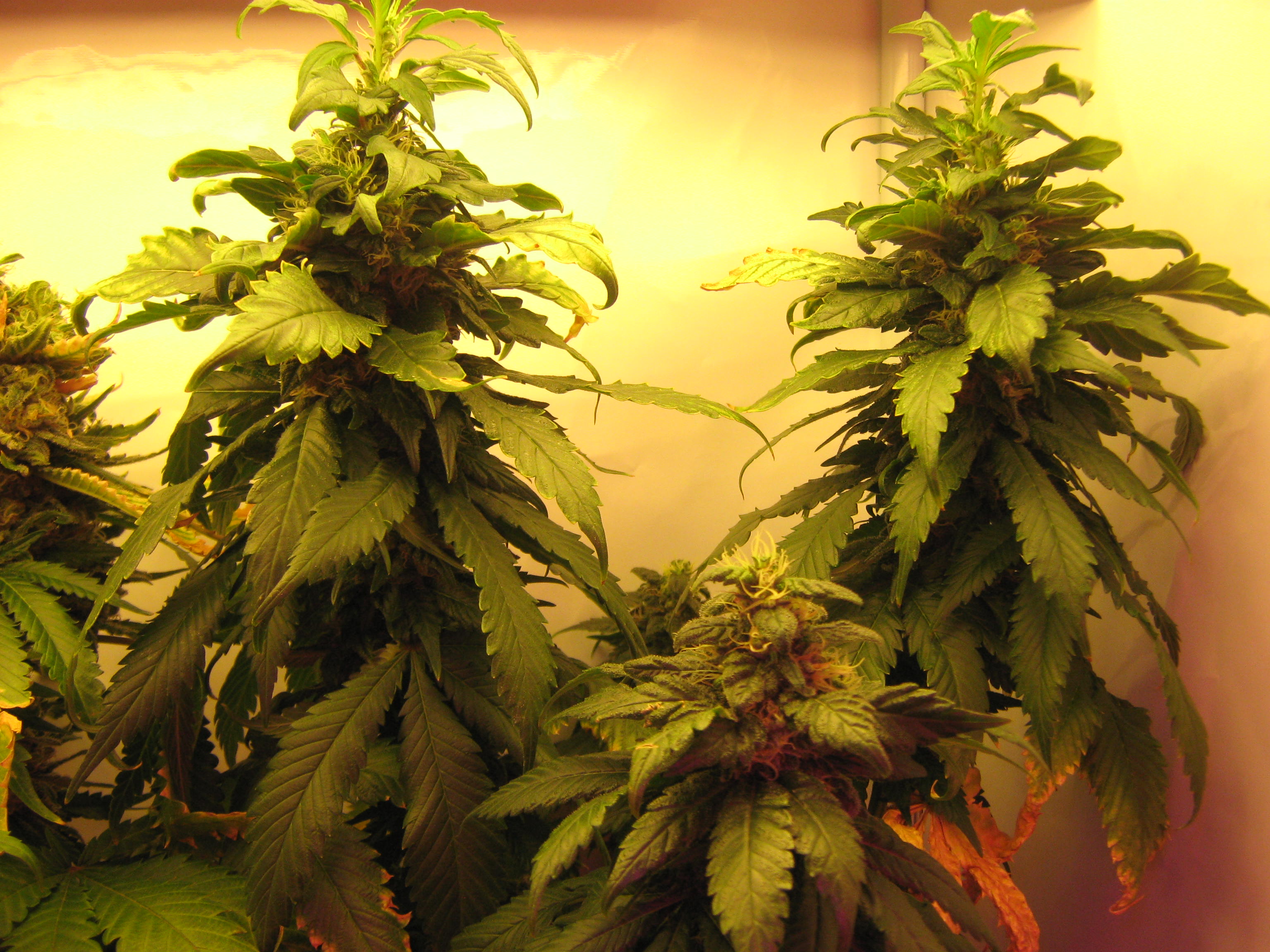 The plants are actually now harvested, and I am surprised at the results. You’ll soon see that 100 Watts (or a hair more) of CFL lighting can make you a rather happy home grower. But I digress… We first need to catch up with some pictures from last week showing our two plants in the final weeks of flowering. They fattened up nicely, although the Double Gum/Afghan Kush cross kept itself well hidden in a wreath of dark green leaves.