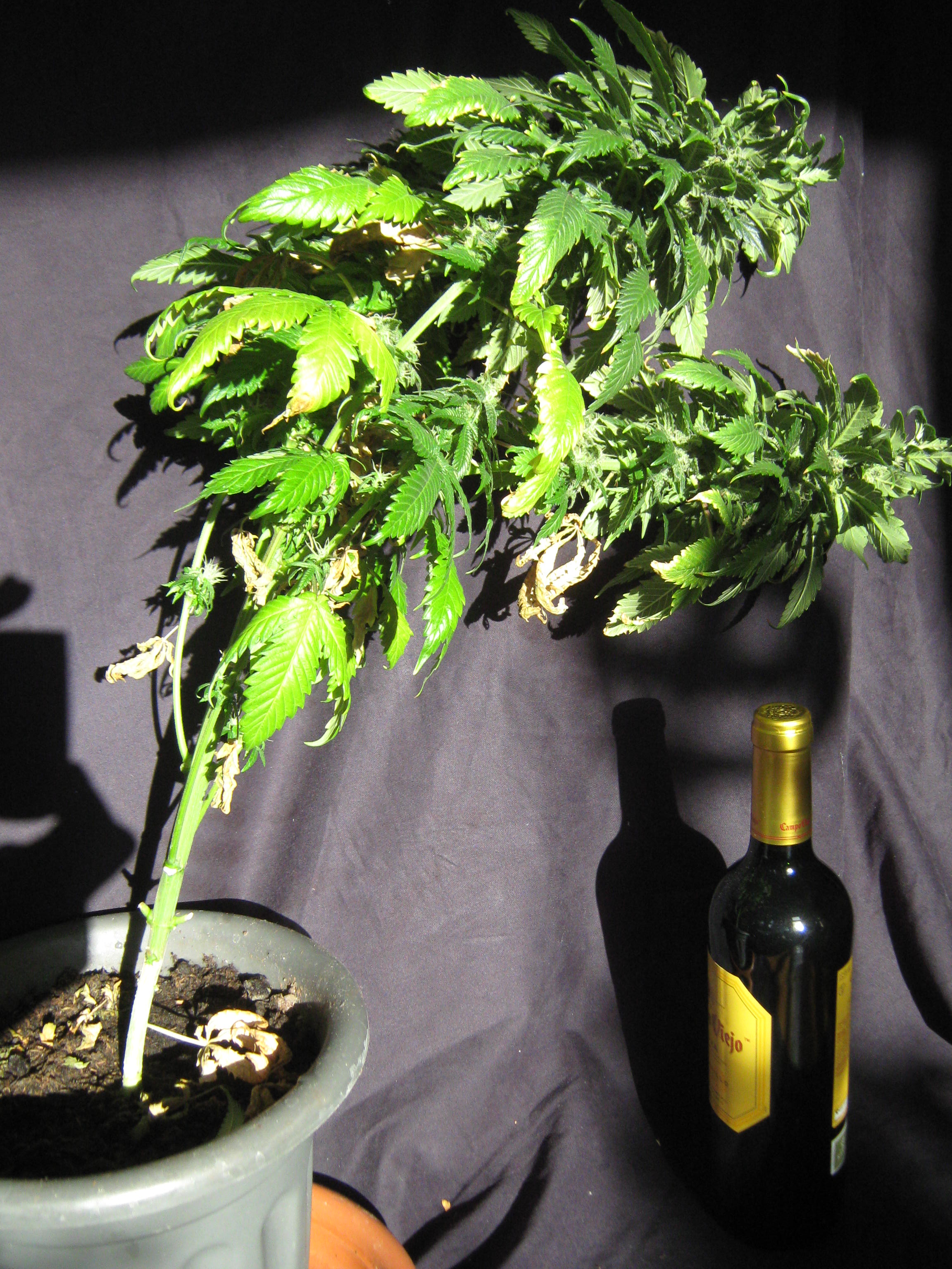 In the above picture, you can see that the Dinafem Critical+ plant was literally drooping over from the weight of the maturing buds. I’ve placed a bottle of wine next to the plant for scale. As you can see, some of the untrimmed buds had nearly the circumference of a wine bottle! I am thoroughly impressed with the performance of this strain under these humble lighting conditions, and would certainly recommend it to home growers.