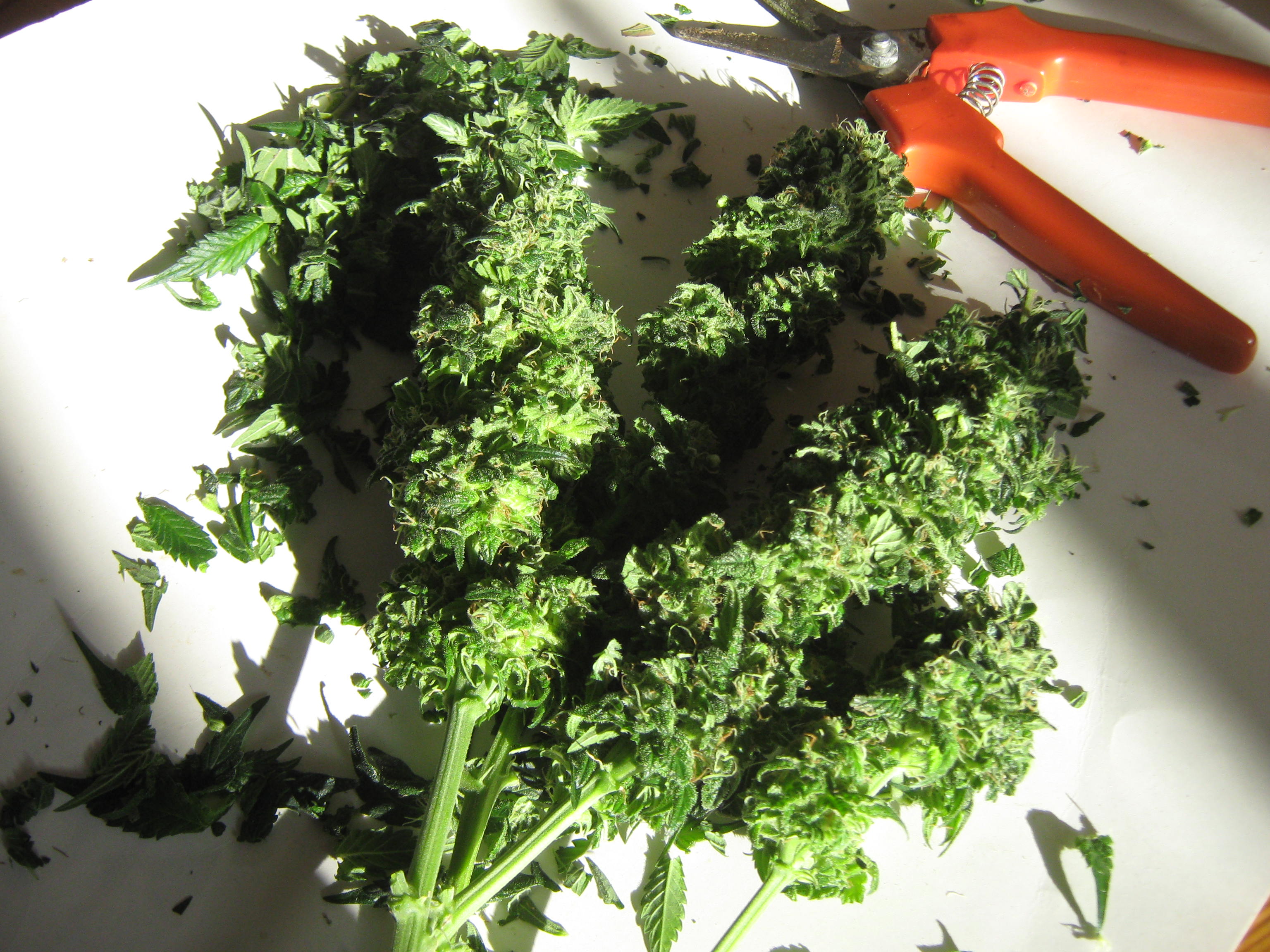 Here are the main buds, fully trimmed and ready for drying. There were heaps of “popcorn” buds and trimmed sugar leaf, which weren’t very photogenic, so I’m sticking with shots of the neatly-trimmed main buds. That trim can all be used for extracts or cooking, and there are a quite few respectable small buds in there, too: