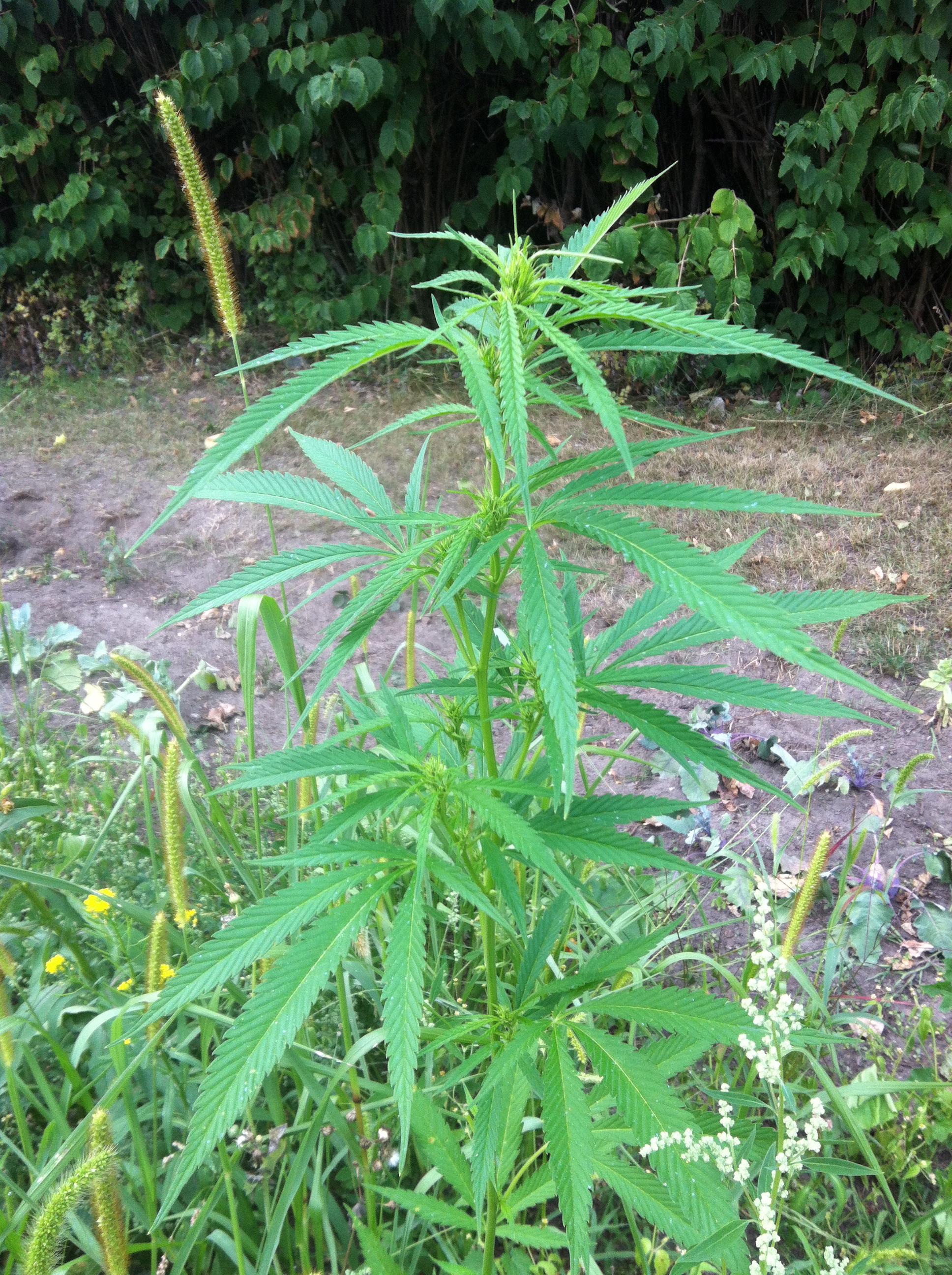 • Be prepared to look for a variety of leaf shapes and plant sizes. I’ve seen mature plants no taller than a dandelion (below) or taller than most basketball players (first image above). Google “cannabis leaves” and have a look – you may find long, thin sativa-like leaves, or broad, fat leaves that almost look like stinging nettle.